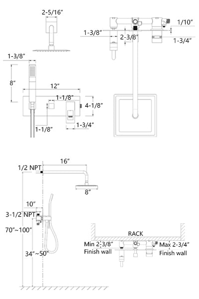 A superfície de qualidade e o aspecto elegante do sistema de duche SUMERAIN complementam qualquer decoração de casa de banho. A válvula áspera é feita de latão sólido resistente, garantindo alta qualidade e longevidade, projetada para instalação fácil com conexões de encanamento padrão dos EUA. O cartucho da válvula de equilíbrio de pressão certificado C-UPC monitora o equilíbrio da pressão da água, ajudando a protegê-lo de ser escaldado por mudanças repentinas na pressão da água quente ou fria. O chuveiro de chuva superfino de aço inoxidável de 8 polegadas pode oferecer um chuveiro de chuva potente e consistente, mesmo sob baixa pressão de água. O conector de ângulo ajustável de 360 graus o torna adequado para todas as famílias em diferentes alturas. Guarde o manual do usuário adequadamente para necessidades futuras.