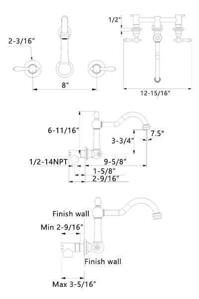 • 2. Cartucho de disco cerâmico anti-gotejamento de 1/4 de volta. São necessários 3 furos de instalação, furos de montagem em parede de 8 polegadas no centro. Alcance do bico de 9-5/8 polegadas.